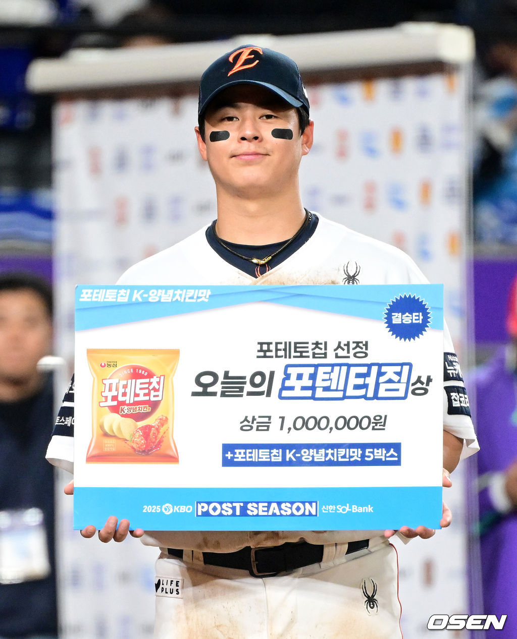 경기 종료 후 오늘의 포텐터짐상을 수상한 한화 노시환이 포즈를 취하고 있다. 2025.10.24 /sunday@osen.co.kr