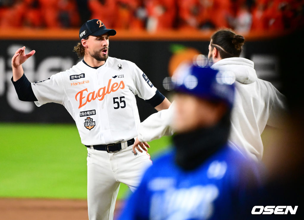 경기를 마치고 한화 와이스, 폰세가 승리를 기뻐하고 있다. 2025.10.24 /jpnews@osen.co.kr