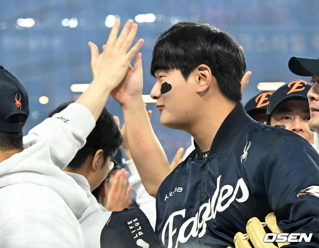 경기 종료 후 한화 김서현이 동료들과 승리의 기쁨을 나누고 있다. 2025.10.24 /sunday@osen.co.kr