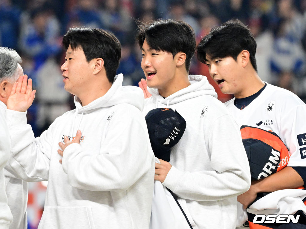 경기 종료 후 한화 정우주가 동료들과 승리의 기쁨을 나누고 있다. 2025.10.24 /sunday@osen.co.kr