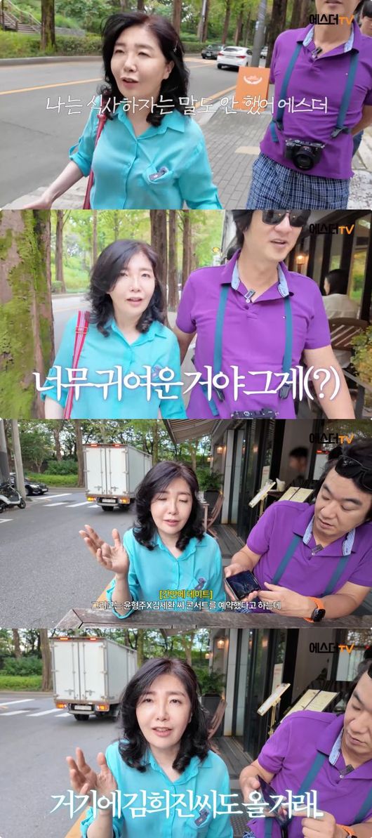 여에스더는 “화를 내는 게 아니라”라면서, “귀엽다고 하는 것은 더 잔 정이 많다는 거 아냐. 그런더니 비온 뒤에 10시 코너를 만들어주면서 희진 씨 올 때는 계속 들여다 보는 거다. 그리고 집에 있는 TV도 다 희진 씨 노래다. 그리고 윤형주, 김세환 씨 콘서트를 예약했다고 하는데 거기에 김희진 씨도 온다는 거다”라고 폭로했다.