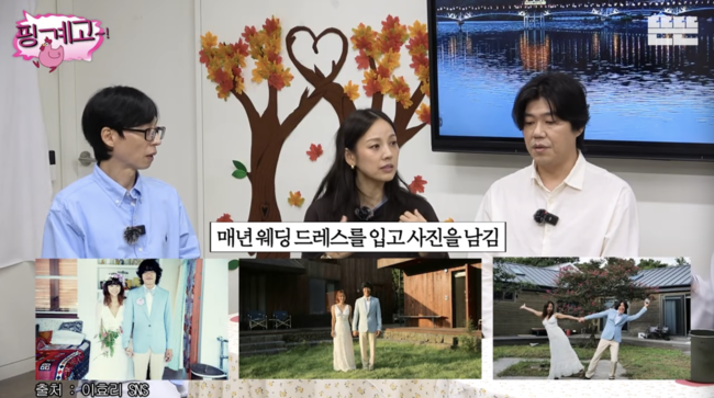 이상순, 이효리 부부는 매년 결혼기념일에 웨딩드레스와 턱시도를 입고 사진을 찍는 것으로 유명하다. 홍현희는 “그게 한결같이 맞냐”고 물었고, 이효리는 “맞았는데 올해 조금 지퍼 올리는데 힘들더라. 처음으로”라고 털어놨다.