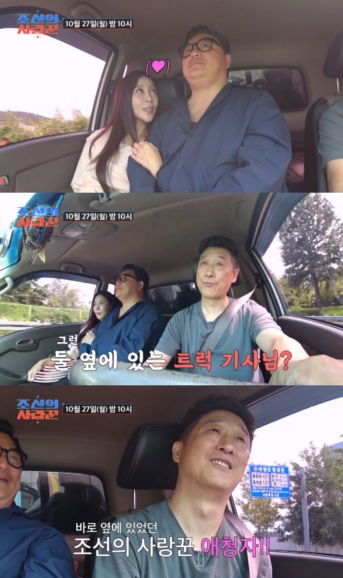 TV CHOSUN 극사실주의 다큐 예능 ‘조선의 사랑꾼’에서 트럭에 함께 탄 윤정수♥원진서가 핑크빛 분위기의 팬서비스에 나선다.