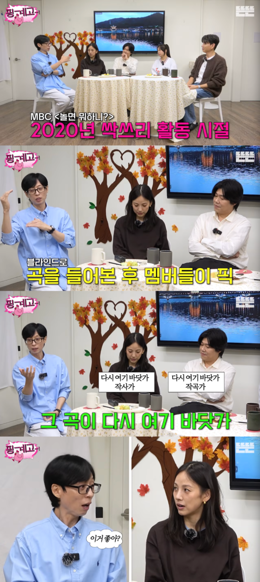 이날 유재석은 이효리와 2020년 ‘놀면 뭐하니?’를 통해 ‘싹쓰리’로 활동했을 때를 언급하며 “내가 지금도 잊혀지지 않는 효리의 모습이 있다. 효리는 모를 거다. 우리가 싹쓰리로 활동할 때 그 당시에 블라인드로 작곡가 분들이 작곡해주신 곡을 들어본 뒤에 멤버들이 픽하는 거였다”라고 설명했다.