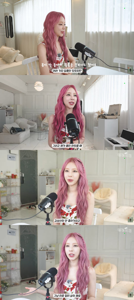 그는 “갑상선 문제로 활동을 오래 쉬었다. 기능 저하가 와서 체력도 많이 깎이고, 무기력한 게 커졌다. 몸이 많이 무거워졌다. 갑상선 기능 저하 같은 경우에는 살이 엄청 찐다. 똑같이 지내도 그냥 이유 없이 살이 찐다. 부기가 안 빠져서 그대로 살이 돼 버리는 느낌”이라고 표현했다.