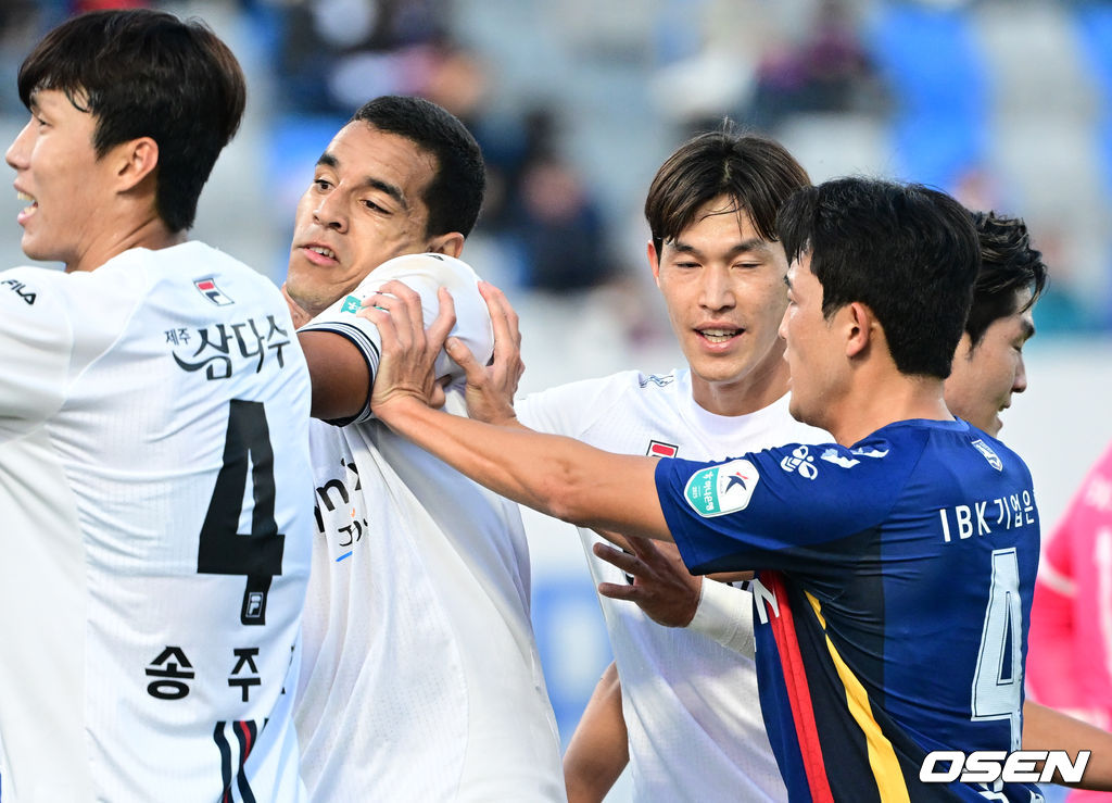 전반 제주SK 조나탄이 중계카메라 앞에서 세리머니를 했으나, 카메라 뒤에 있던 홈 팬들을 의도치 않게 도발하자 수원FC 김태한이 조나탄을 밀치고 있다. 2025.10.25 /cej@osen.co.kr