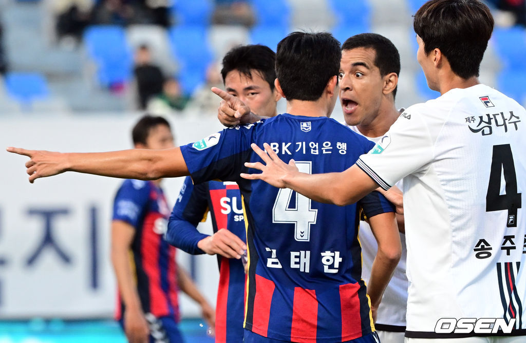 전반 제주SK 조나탄이 중계카메라 앞에서 세리머니를 했으나, 카메라 뒤에 있던 홈 팬들을 의도치 않게 도발하자 수원FC 김태한이 조나탄을 밀치고 있다. 2025.10.25 /cej@osen.co.kr