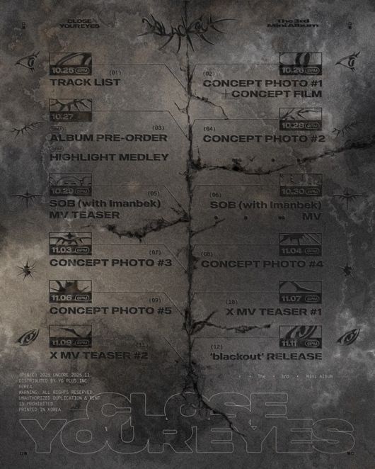 클로즈 유어 아이즈의 전작과 확연히 달라진 콘셉트와 비주얼이 담긴 콘셉트 포토는 무려 다섯 가지 버전으로 공개돼 글로벌 팬심을 저격한다. 이 외에도 새 앨범 '블랙아웃'이 품고 있는 무드를 더욱 생생하게 전달할 콘셉트 필름, 수록곡 전곡을 미리 들어볼 수 있는 하이라이트 메들리 등 다채로운 콘텐츠가 차례로 공개돼 컴백 기대감을 끌어올릴 예정이다.