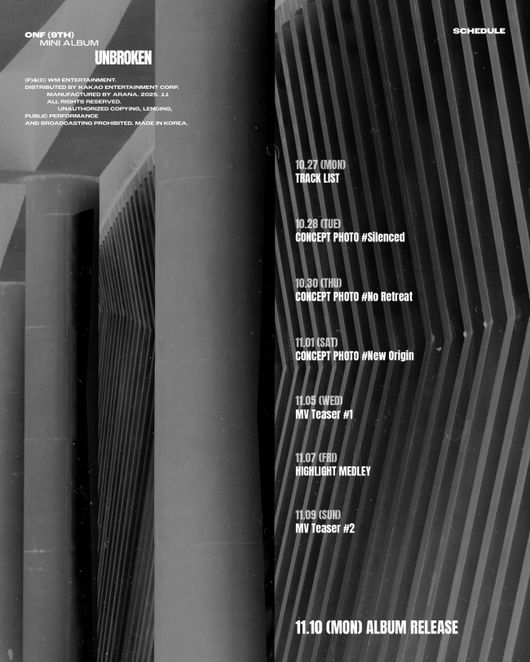 온앤오프의 소속사 WM엔터테인먼트는 25일 0시에 공식 계정을 통해 미니 9집 앨범 ‘UNBROKEN’(언브로큰)의 타임테이블을 공개했다.