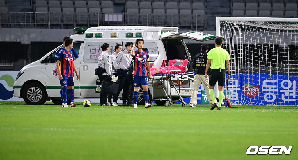 후반 제주SK 최병욱이 슛을 시도하던 중 발로 수원FC 황재윤의 머리를 가격했다. 이로 인해 황재윤이 구급차에 실려나가고 있다. 최병욱은 레드카드 퇴장. 2025.10.25 /cej@osen.co.kr