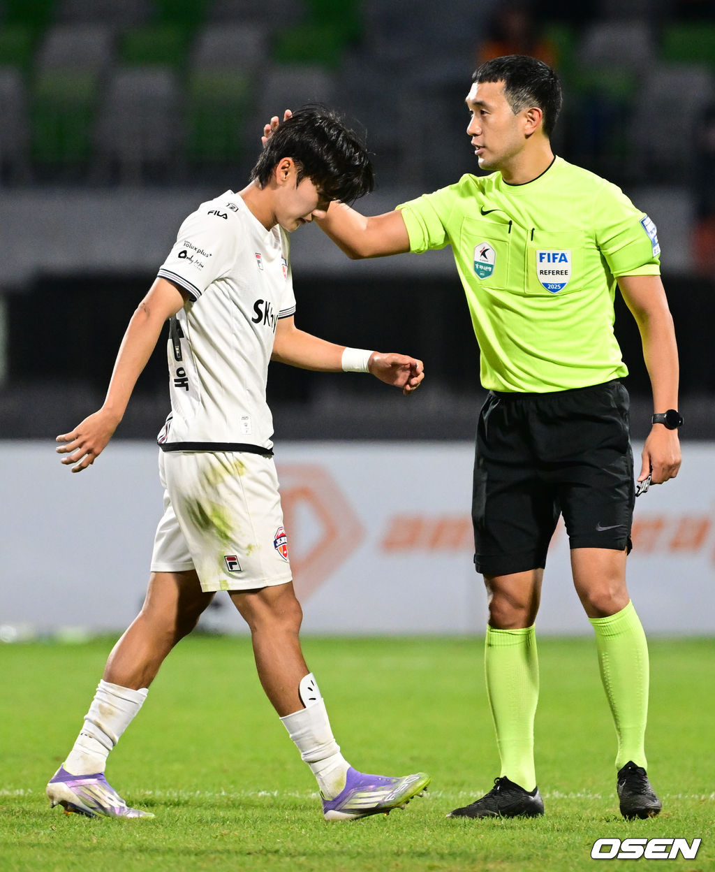 후반 제주SK 최병욱이 슛을 시도하던 중 발로 수원FC 황재윤의 머리를 가격한 뒤 강한 반칙으로 레드카드 퇴장당하고 있다. 황재윤은 구급차로 실려나갔다. 2025.10.25 /cej@osen.co.kr