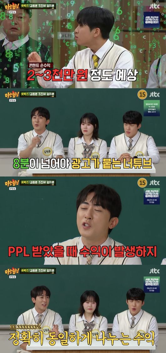 김원훈은 “세무조사 나온 것도 아니고 왜 이렇게 디테일 하냐”라면서도 “얼추 비슷하다. 우리 영상 자체가 짧다. 너튜브는 8분 이상이 넘어야 광고가 붙는다. 우리는 광고 붙일 수 있는 영상이 많지 않다. PPL 받았을 때 수익이 좀 많이 발생한다”라고 밝혔다.