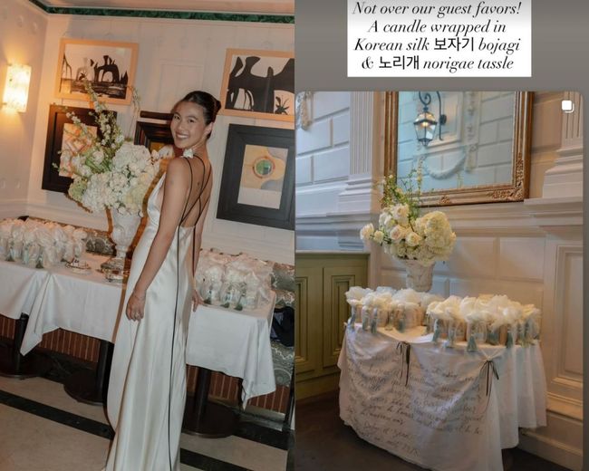 정다혜 씨는 25일 자신의 SNS를 통해 "우리 하객 선물 정말 마음에 들어요. 한국 실크 보자기와 노리개 장식으로 포장된 양초랍니다"라는 글과 함께 여러 장의 사진을 게재했다.