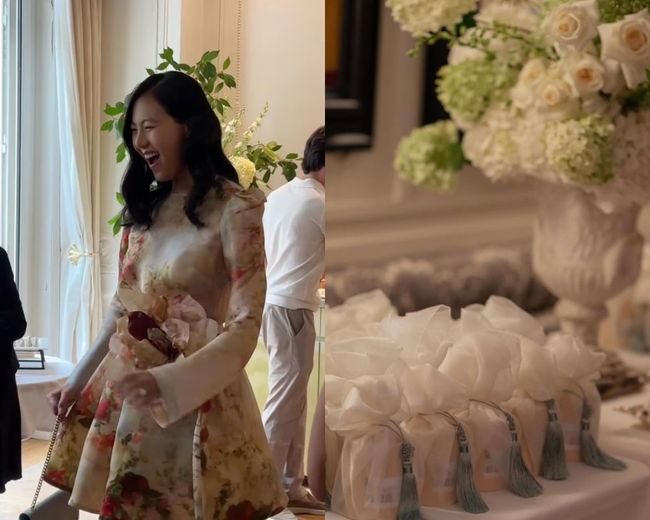 프랑스 명품 브랜드 지방시(Givenchy) 창립자의 후손과 결혼한 정다혜 씨가 한국적 감성을 가득 담은 결혼식 답례품과 화려한 결혼식 현장을 전했다.