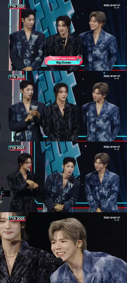 빅오션(찬연, PJ, 지석)은 지난 25일 서울 성북구 고려대학교 화정체육관에서 개최된 ‘틱톡 어워즈 2025(TikTok Awards Korea 2025)’에 참석해 대중들에게 긍정적인 영향력을 펼친 아티스트에게 수여하는 상인 ‘소셜 임팩트 아티스트상’을 수상했다.