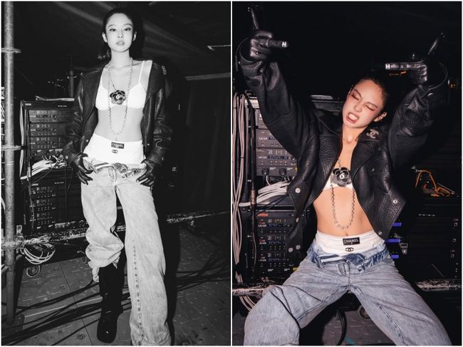 공개된 사진 속 제니는 흰 브라톱에 리선보다 아래로 내려 입어 언더웨어나 이너 팬츠가 보이는 루즈한 새깅 팬츠를 매치했다. 여기에 블랙 가죽 재킷을 걸친 채 특유의 시크한 눈빛을 드러냈다. 샤넬 로고가 새겨진 벨트와 진주 네크리스, 블랙 장갑 등으로 완벽히 스타일을 마무리하며 ‘샤넬 앰버서더’다운 압도적 존재감을 발산했다.