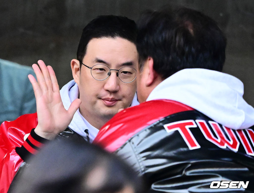 LG 구광모 회장이 차명석 단장과 하이파이브를 하며 승리를 기뻐하고 있다. 2025.10.26 /jpnews@osen.co.kr