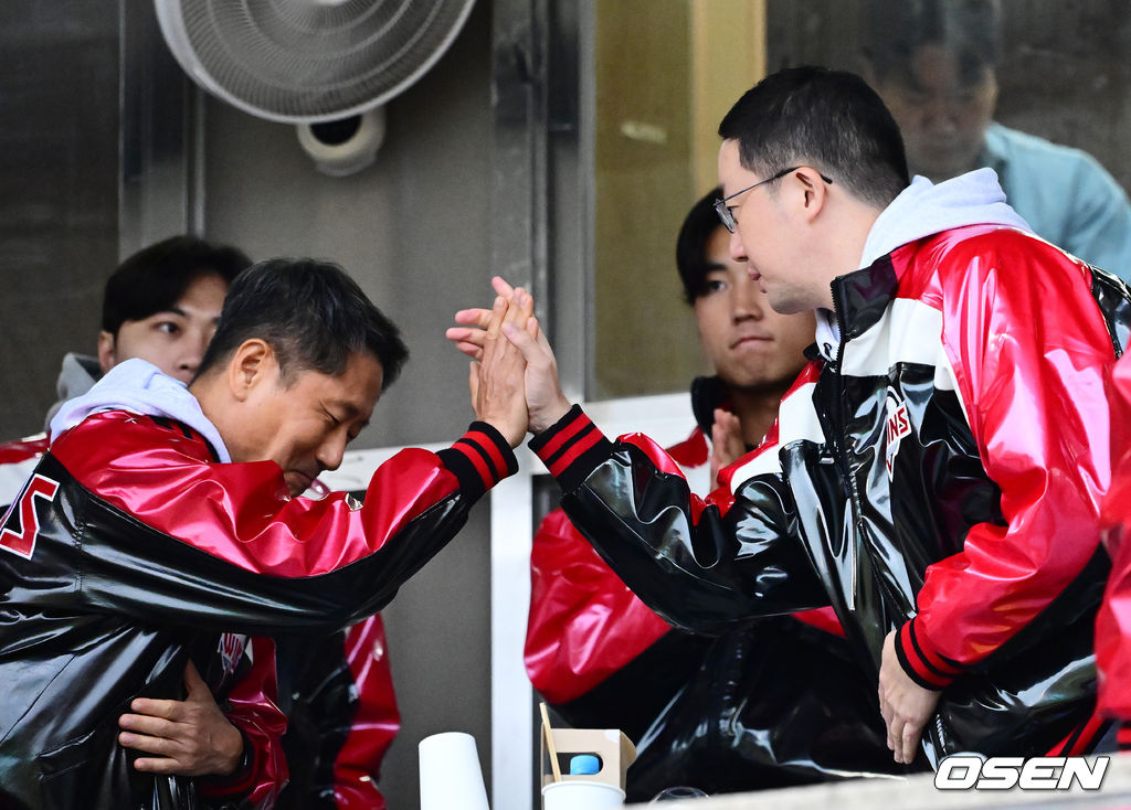 LG 구광모 회장이 김인석 LG스포츠 대표이사와 하이파이브를 하며 승리를 기뻐하고 있다. 2025.10.26 /jpnews@osen.co.kr