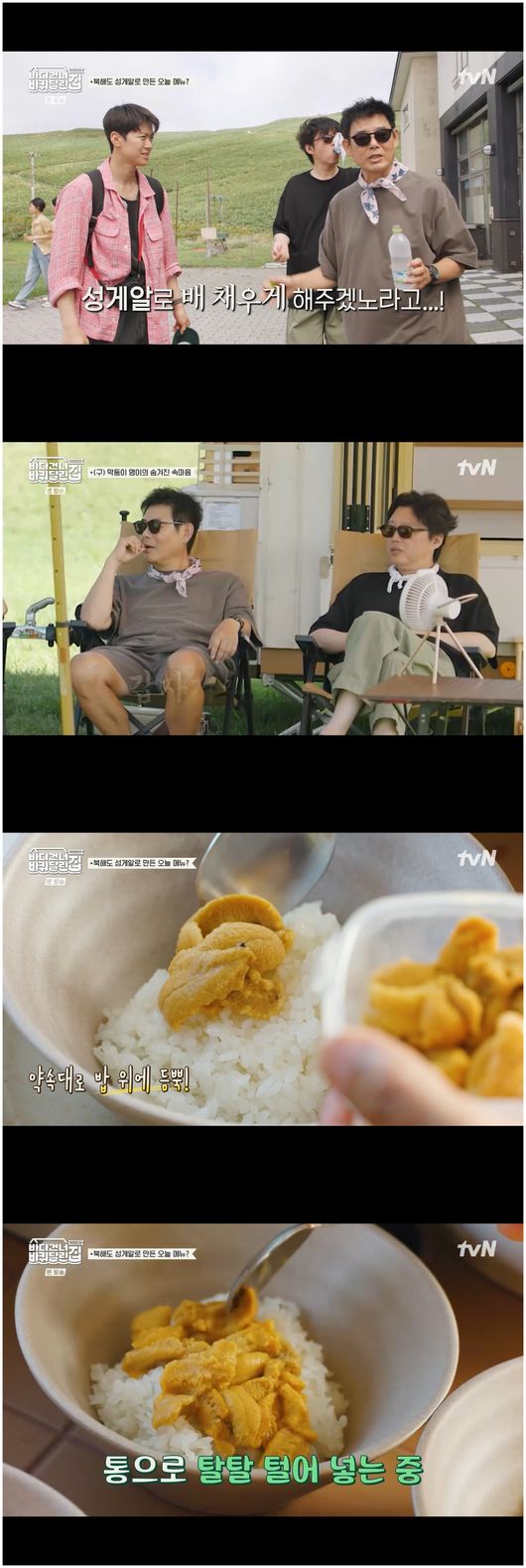 이들은 북해도 명물인 성게알을 샀다. 산지여도 두 판에 무려 10만 원 꼴이었다. 그러나 성동일은 "성게알을 배 터지게 먹게 해주겠다"라며 호언했고, 다시마 밥을 지어 그 위에 노른자, 성게알, 실파, 참기름을 얹어 끝내주는 성게알 덮밥을 만들었다.