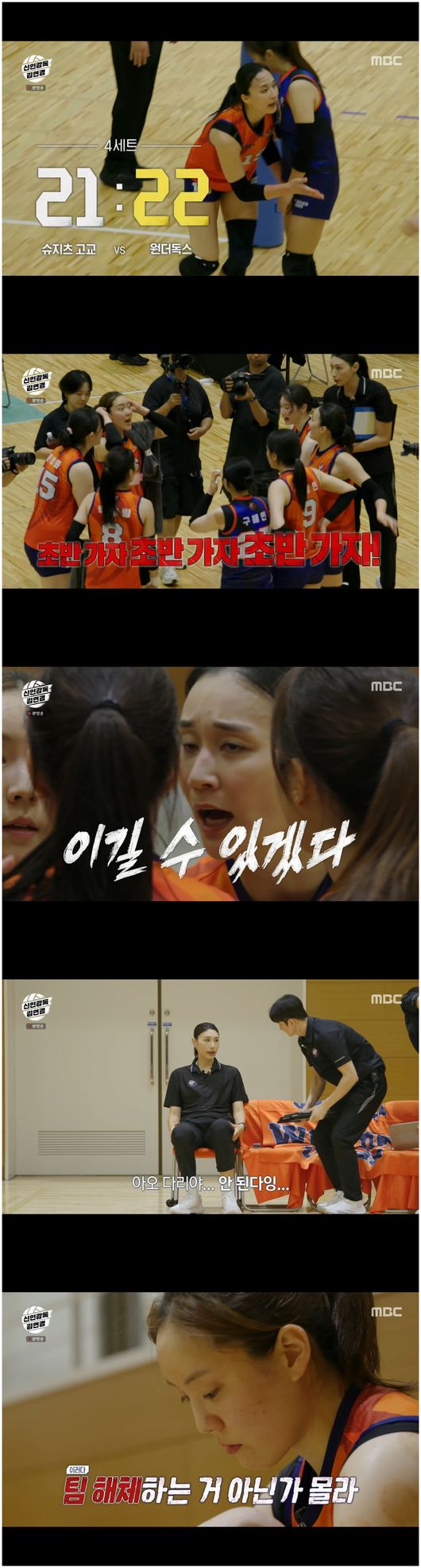 26일 방영된 MBC 일 예능 ‘신인감독 김연경’에서는 지난주에 이어 슈지츠 고등학교와의 접점이 그려졌다. 1,2세트 모두 원더독스가 가져온 상황에서 한 세트만 따내면 됐지만, 이는 쉽지 않았다. 표승주는 “버텨! 버텨! 하나만 하면 돼!”라며 외쳤으나 결국 점수 차는 벌어졌고 김연경은 공격력 최강인 인쿠시를 뺄 수밖에 없었다. 게다가 서브 범실로 3세트는 완벽히 일본에게 넘어가고 말았다.