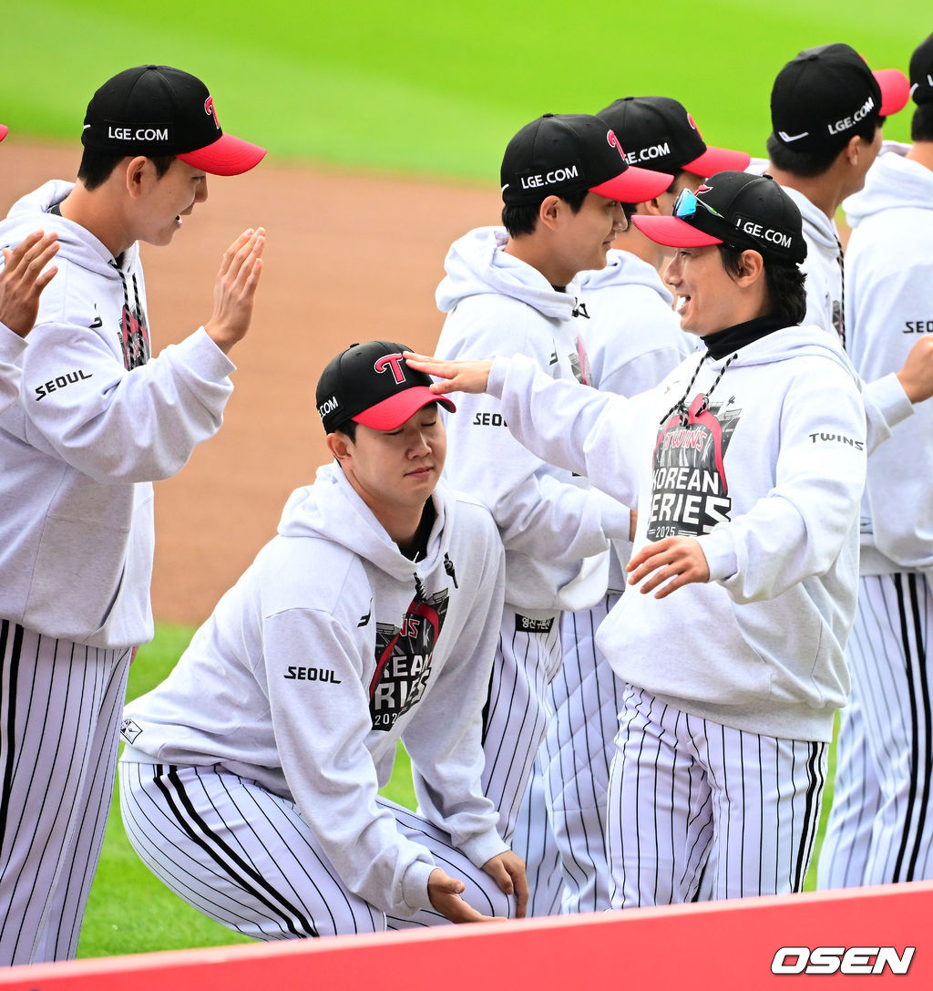 경기에 앞서 LG 신민재가 스타팅 라인업 소개에 그라운드에 들어서며 유영찬과 하이파이브를 하고 있다. 2025.10.26 /jpnews@osen.co.kr