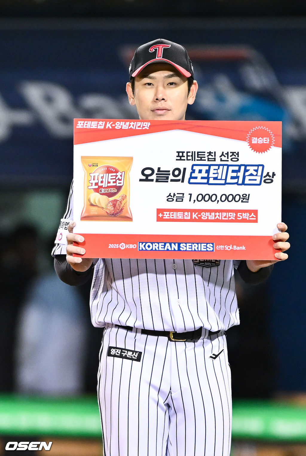 경기종료 후 결승타 주인공 홍창기가 포텐터짐상을 받은뒤 포즈를 취하고 있다. 2025.10.27 / soul1014@osen.co.kr