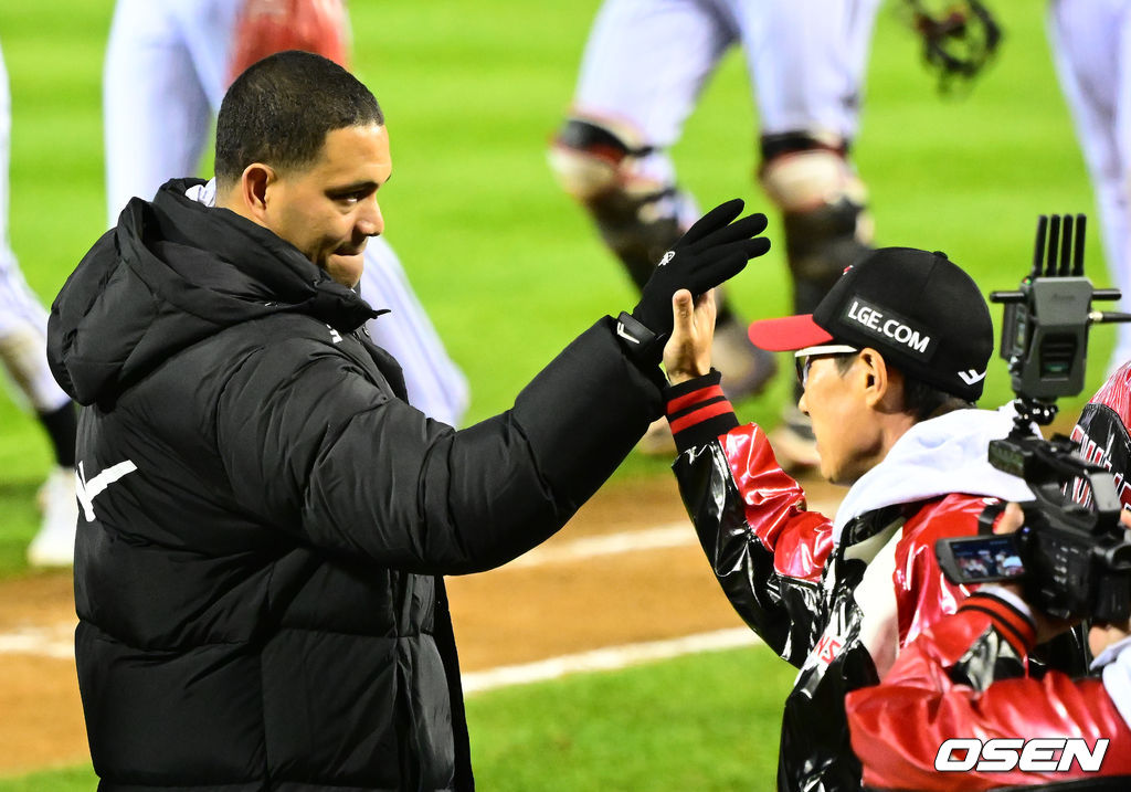 경기를 마치고 LG 염경엽 감독이 치리노스와 승리 하이파이브를 하고 있다. 2025.10.27 /jpnews@osen.co.kr
