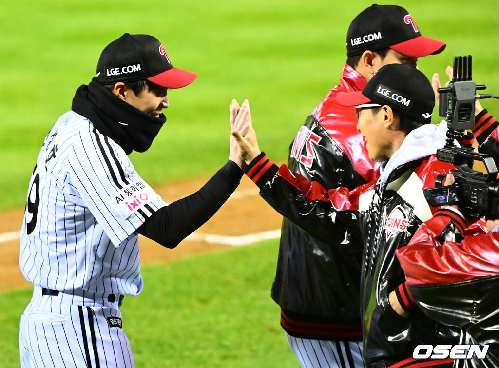경기를 마치고 LG 염경엽 감독이 천성호와 승리 하이파이브를 하고 있다. 2025.10.27 /jpnews@osen.co.kr
