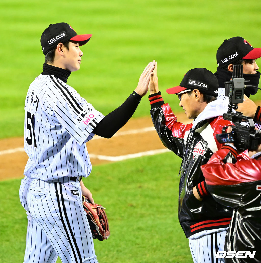 경기를 마치고 LG 염경엽 감독이 홍창기와 승리 하이파이브를 하고 있다. 2025.10.27 /jpnews@osen.co.kr