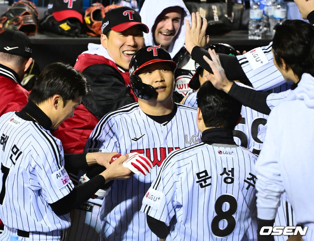 8회말 2사 1루에서 LG 문보경이 좌월 투런포를 날리고 더그아웃에서 동료선수들과 세리머니를 하고 있다. 2025.10.27 /jpnews@osen.co.kr