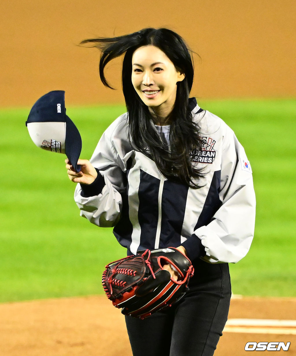 경기에 앞서 배우 김소연이 시구를 하고 있다. 2025.10.27 /jpnews@osen.co.kr
