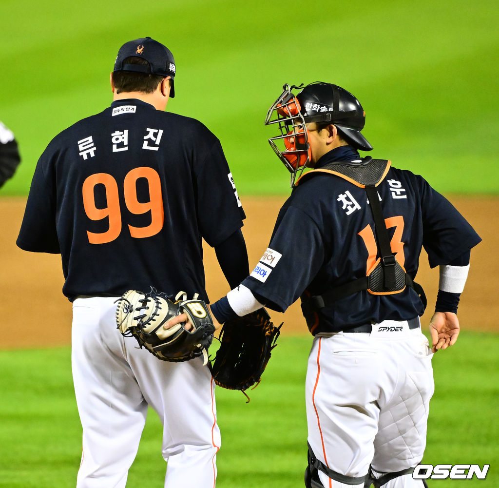 2회말 무사 1,3루에서 한화 류현진이 LG 오지환에 볼넷을 허용하자 마운드에 올라 이야기를 나누고 있다. 2025.10.27 /jpnews@osen.co.kr