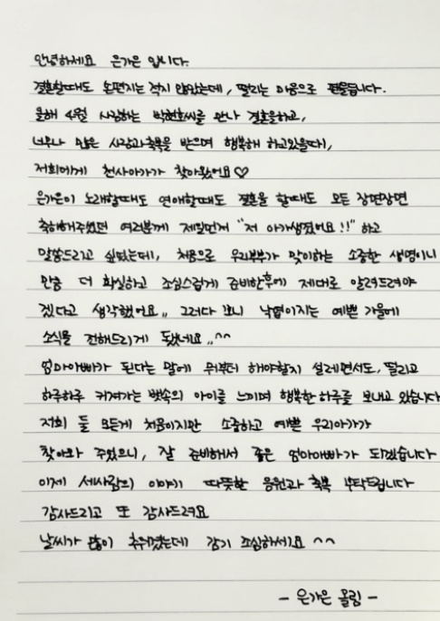 가수 은가은이 결혼 6개월 만에 임신 소식을 전하며 직접 자필 편지로 설렘 가득한 소감을 전했다. 특히 6개월만에 임신 소식이라 더욱 축복이 쏟아진다.