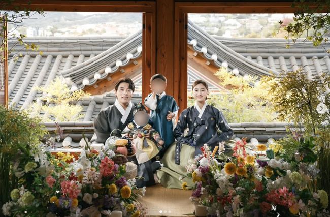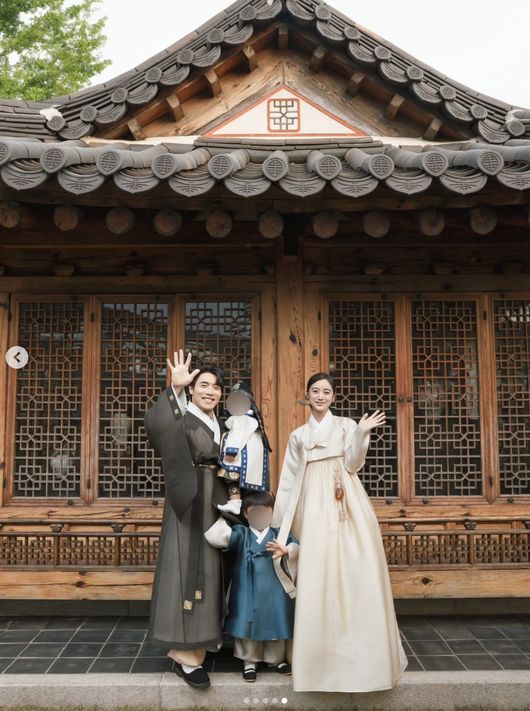 뿐만 아니라 어두운 차콜 계열의 저고리와 올리브색 치마를 입으며 고풍스러운 자태를 드러냈고, 또 다른 사진에서는 아이보리빛 저고리와 치마를 선택해 단정한 느낌을 전했다. 첫째 아들과 둘째 아들은 남색 한복을 입으며 귀여움을 뽐냈다.