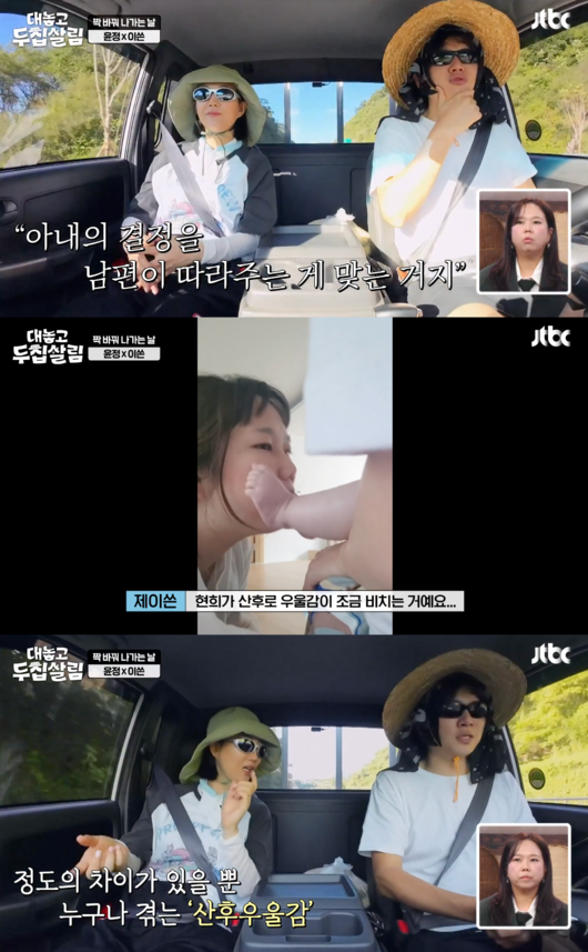 장윤정은 “현희 아기 낳고 좀 힘들어했지?”라고 물었다. 이에 제이쓴은 “많이 힘들어했다. 현희가 산후우울감이 조금 비치는 거다. 배우자라면 알지 않냐. 그래서 밖으로 나가라고 했다. 애기는 내가 볼테니까 그게 출산하고 한 달? 두 달? 그랬다”고 했다.