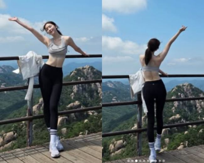 특히 사진 속 그는 등산이라고 믿기지 않는 과감한 패션으로 시선을 사로잡았다. 다리에 밀착한 레깅스는 물론 복근과 배를 과감하게 드러낸 브라톱까지 레깅스 운동복을 입고 등산길에 오른 것이다.