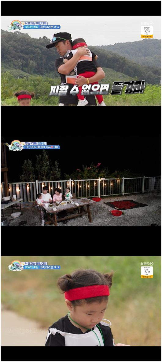 장동민은 원주 집에서 지우 남매를 데리고 달리기 연습을 매진했다. 중간에는 장동민의 어머니가 스케치북을 들고 손자와 손녀를 응원하기도 했다. 지우는 힘들어서 어쩔 줄 몰라했지만, 장동민은 “지우야, 그런 말이 있어. 피할 수 없으면 즐겨라”라고 말했다. 상위 1% 안에 드는 언어 능력의 지우는 “피할 수 없으면 즐겨라! 아빠, 힘내세요”라며 그 말을 이해하면서 동시에 장동민을 응원하는 효심을 보였다.