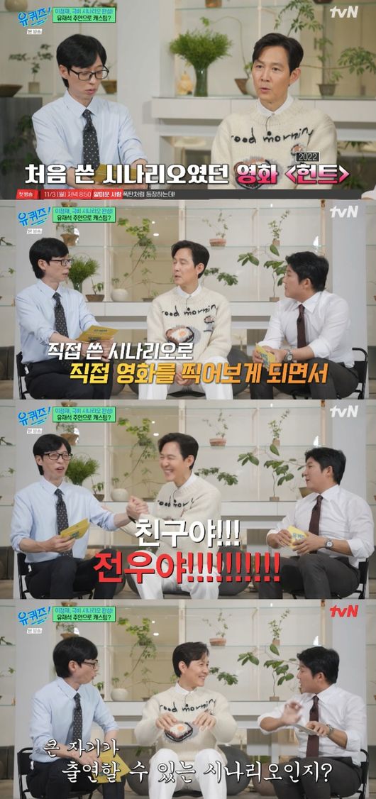 이날 유재석은 “배우 활동도 하고 있지만 감독도 하시고, 최근 시나리오를 쓰고 있다는 소문이 들리더라”라고 물었다. 이정재는 “제가 시나리오 쓸 줄 정말 꿈에도 몰랐는데. 처음에 ‘헌트’를 시나리오 쓰게 됐다”라고 말문을 열었다.