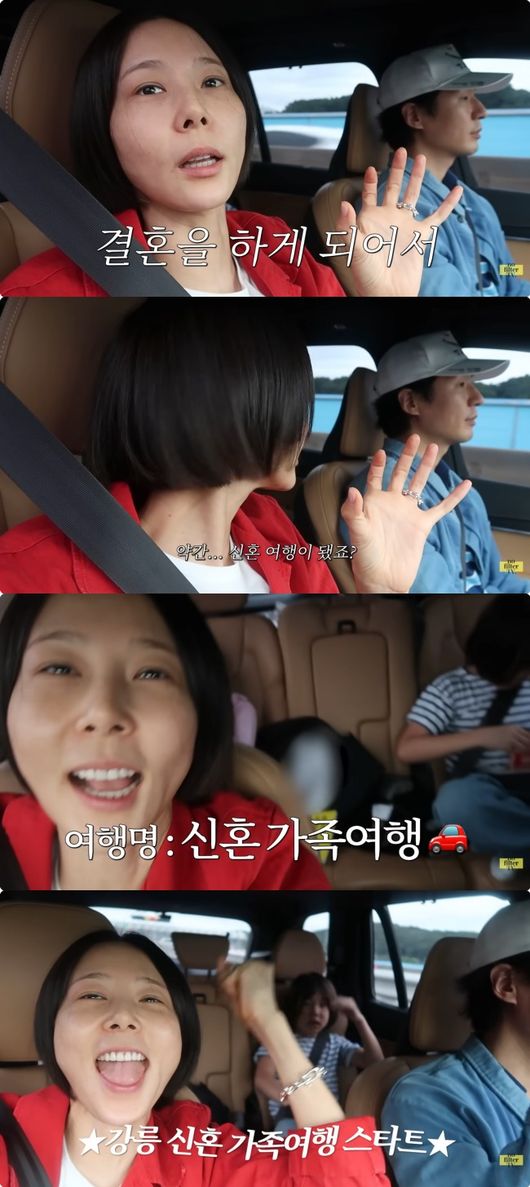 먼저 김나영은 여행을 가는 길에 “추석 연휴를 맞이해서 강릉으로 가족 여행을 떠나고 있다. 두, 세 달 전에 너무 가보고 싶은 숙소가 있어서 예약을 해놨었다. 그런데 저희가 마침 결혼을 하게 돼서 약간 신혼 여행이겠죠? 신혼 가족 여행”이라고 설명했다.