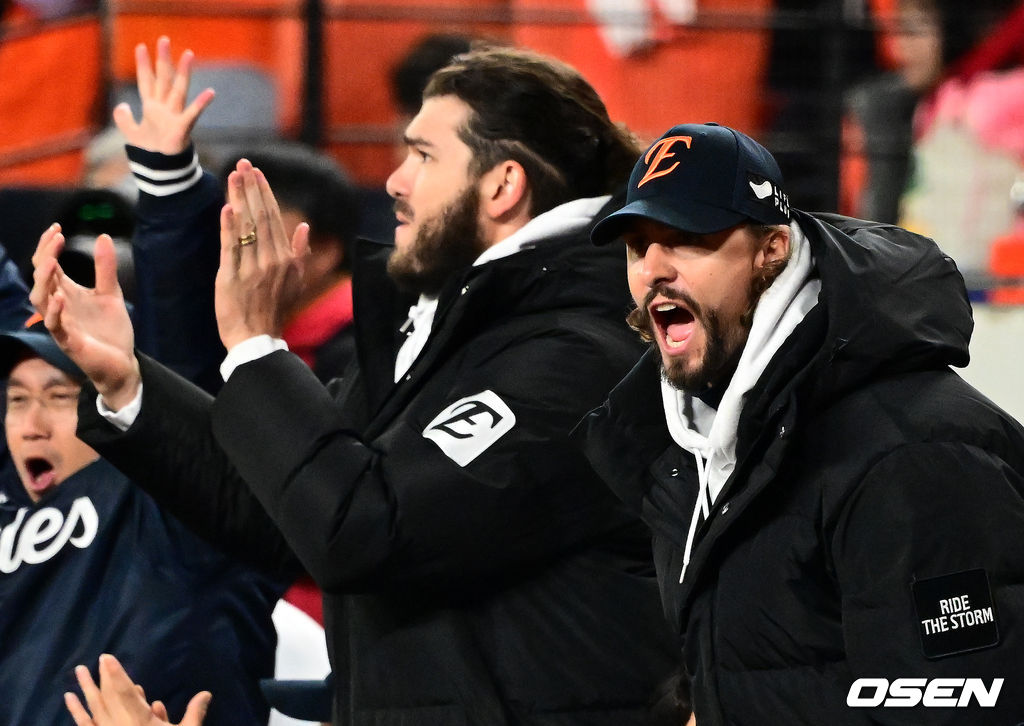 8회말 2사 만루에서 한화 폰세, 와이스가 황영묵이 밀어내기 볼넷을 얻어내며 동점에 성공하자 기뻐하고 있다. 2025.10.29 /jpnews@osen.co.kr