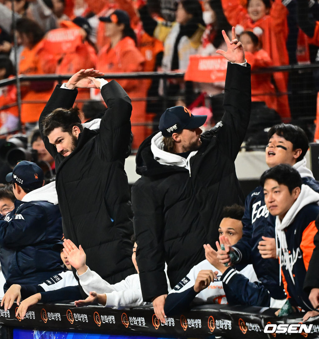 8회말 2사 만루에서 한화 폰세, 와이스가 황영묵이 밀어내기 볼넷을 얻어내며 동점에 성공하자 기뻐하고 있다. 2025.10.29 /jpnews@osen.co.kr