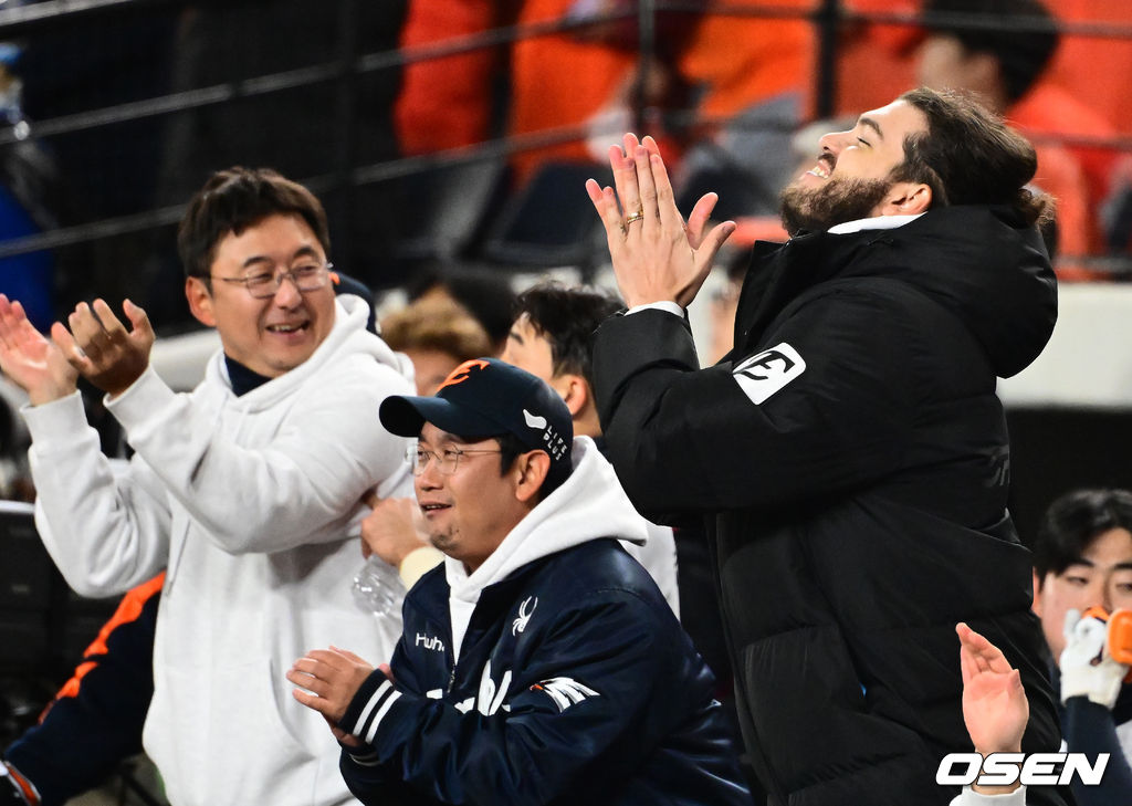 8회말 2사 만루에서 한화 심우준의 역전 2타점 적시 2루타에 더그아웃의 폰세가 기뻐하고 있다. 2025.10.29 /jpnews@osen.co.kr