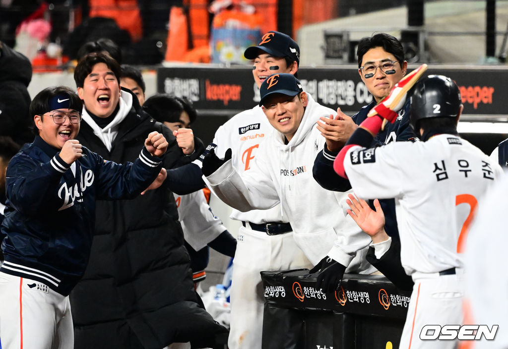 8회말 2사 2,3루에서 한화 심우준이 최재훈의 2타점 적시타에 득점에 성공하며 동료선수들과 기뻐하고 있다. 2025.10.29 /jpnews@osen.co.kr