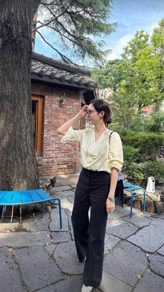 공개된 사진에는 편안한 차림으로 외출에 나선 성유리의 모습이 담겨 있었다. 성유리를 검정색 하의와 노란빛의 블라우스를 입고 걷고 있었다. 올림 머리 스타일에 안경을 매치해 편안하면서도 센스 있는 패션을 완성했다.