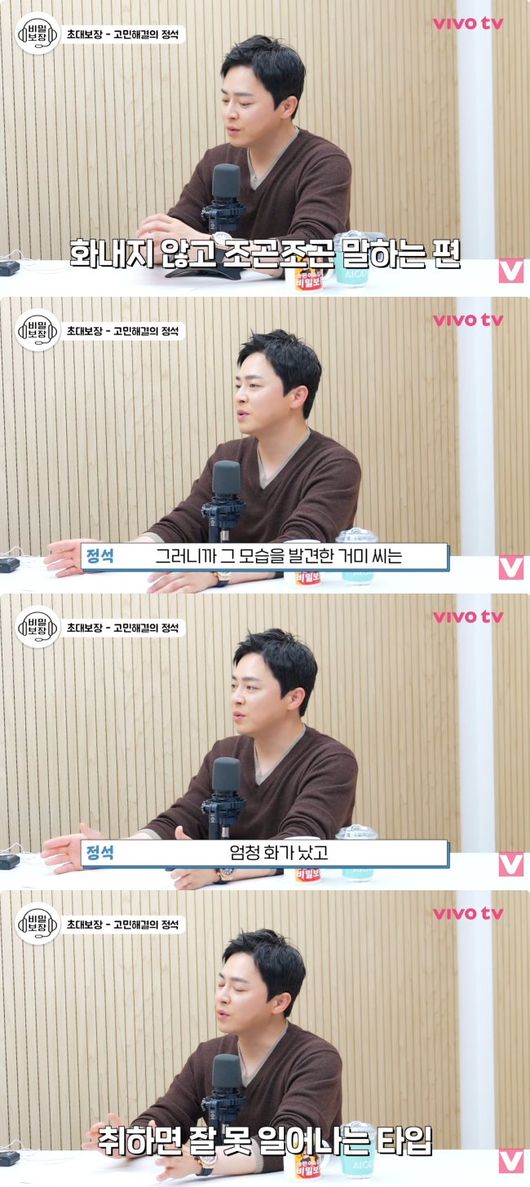 조정석은 “진짜 무섭게 혼났던 거는 대리운전해서 집에 왔는데 뒷자석에서 자고 있었던 거다. 그때는…”이라며, “집에 간다고 하니까 기다리고 있었던 거다. 오지 않아서 밖에 나와 봤더니 내가 차 뒷좌석에서 자고 있었다. 그 모습을 발견한 거미 씨는 엄청 화가 났고, 저는 어느새 집 소파에 앉아서 고개를 숙이며… “라고 에피소드를 털어놨다.