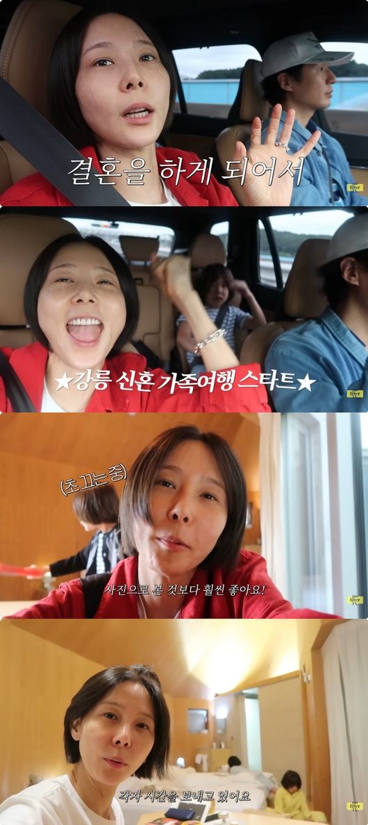 김나영은 남편이 된 마이큐, 두 아들 신우, 이준과 차를 타고 이동하면서 “추석 연휴를 맞이해서 강릉으로 가족 여행을 떠나고 있다. 두, 세 달 전에 너무 가보고 싶은 숙소가 있어서 예약을 해놨었다. 그런데 저희가 마침 결혼을 하게 돼서 약간 신혼여행이겠죠? 신혼 가족여행”이라고 말문을 열었다.