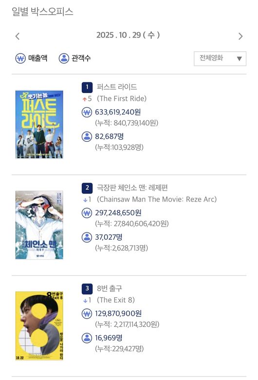 '퍼스트 라이드'가 10월 29일(수) 개봉 첫 날 82,687명(누적 관객수 103,928명)을 동원하며 '극장판 체인소 맨: 레제편'을 제치고 압도적 박스오피스 1위에 올랐다. 이는 385만 흥행작 '소방관'의 오프닝 스코어(81,673명)를 경신한 수치다. 또한, 강하늘의 전작이자 337만을 동원하며 2025년 한국영화 흥행 2위를 기록하고 있는 '야당'의 오프닝 스코어(85,705명)을 잇는 기록으로 앞으로 펼쳐질 유쾌한 입소문 레이스에 대한 기대감을 모은다.
