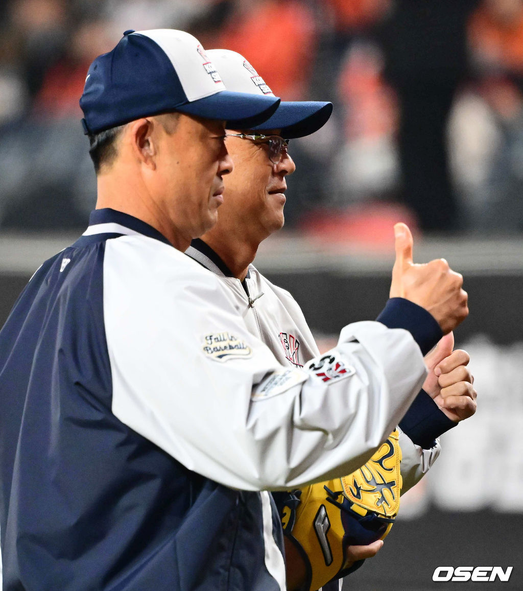 경기에 앞서 한화 1999년 우승 멤버 조경택, 구대성이 시포, 시구 행사를 마치고 포즈를 취하고 있다. 2025.10.29 /jpnews@osen.co.kr