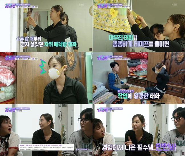 도구 하나 없이 곰팡이가 가득 핀 벽지를 뜯어내야 하는 상황이 되자 윤태화는 주위에서 납작한 돌을 찾아오는 기지를 발휘하기도 했다. 모두가 돌을 들고 제거 작업에 나서는 모습은 21세기 신석기 현장을 연상하게 했다. 이어 윤태화는 시트지 재단에서부터 풀칠까지 꼼꼼하게 작업하며 무대 위에서의 화려한 모습과는 또 다른 똑소리 나는 면모를 돋보였다.