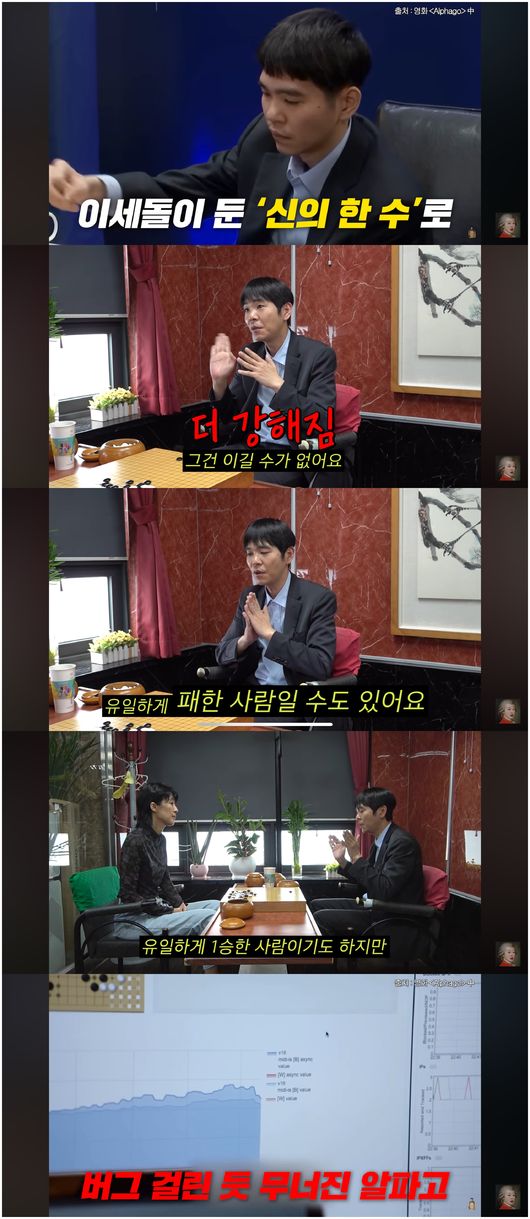 그러나 이세돌에게는 인공지능 알파고에게 유일하게 이긴 인간이라는 타이틀이 있었다. 이에 대해서도 이세돌은 겸허했다. 이세돌은 “유일하게 이긴 사람이기도 하지만 유일하게 패한 사람도 있다. 커제 9단이 알파고 상위 버전으로 바둑을 뒀다. 당연히 졌다. 그건 사람이 이길 수 없다. 그래서 정식 승부라고 생각하지 않은 것 같다”라면서 “전 유일하게 이긴 것이자 진 사람일 수 있다”라며 말했다.